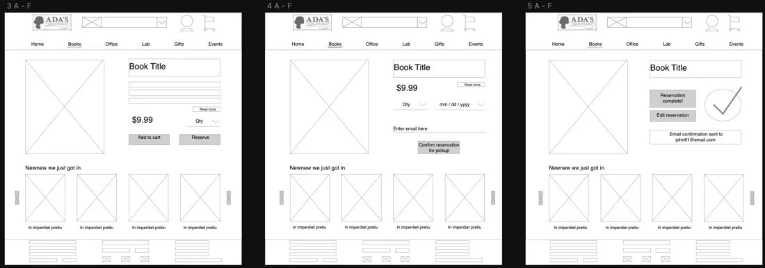 Ultimately, these storyboards and sketches helped me see through problem areas on Ada’s site, then ideate through all three iterations of what would end up becoming wireframes.